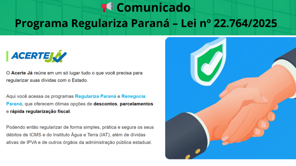A Receita Estadual do Paraná informa que está aberta a adesão ao Programa Regulariza Paraná, instituído pela Lei nº 22.764/2025 e regulamentado pelo Decreto nº 12.099/2025.O programa permite a regularização de débitos tributários e não tributários, com condições especiais de redução de multas, juros e encargos financeiros. A adesão deve ser realizada por meio do […]