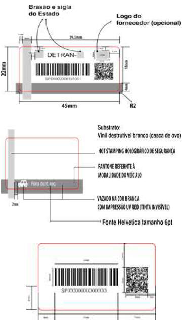 2.1. Material: A etiqueta deve ser produzida em material de vinil destrutível, também conhecido como “casca de ovo”, de alta adesividade, resistente a intempéries, de cor branca, de modo a garantir sua desfiguração quando retirada após a devida aplicação, inviabilizando nova utilização.